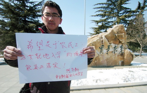 9 марта А Эрсинь, студент Китайского народного университета, сообщил корреспондентам, что в настоящее время он проводит социальное обследование по вопросу положения детей из семей миграционных рабочих, и высказал пожелание, чтобы депутаты во время работы сессий уделили внимание вопросу обеспечения для этих детей школьного образования по месту работы их родителей».