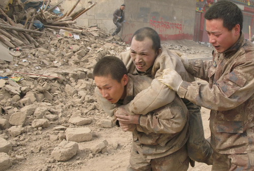 После того как 14 апреля утром в уезде Юйшу провинции Цинхай /Северо-Западный Китай/ произошло землетрясение магнитудой 7,1, военнослужащие Ланьчжоуского военного округа и сотрудники вооруженной милиции, расквартированные в этой провинции, незамедлительно приступили к ликвидации последствий стихии.