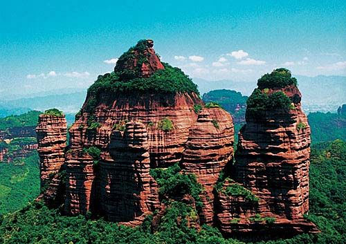 Данься -- название одного из типов рельефа, которое ему присвоили китайские геологи Фэн Цзинлань и Чэнь Года в 20-30 гг. прошлого столетия после завершения экспедиции в горах Шаогуаньшаньпровинции Гуандун /Южный Китай/. По данным, этот тип рельефа сформировался за время от юрского до третичного периода. Он характеризуется изолированными остроконечными вершинами и обрывистыми причудливыми скалами из песчаника красного цвета. Рельеф Данься обусловлен прежде всего интенсивно протекающим физическим выветриванием осадочной горной породы.(а-во Синьхуа)