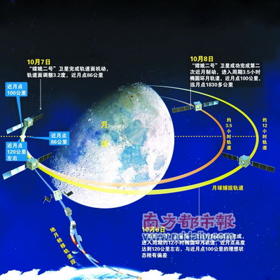 Сегодня в 10:45 под точным контролем Пекинского центра управления полетами китайский исследовательский аппарат зондирования Луны "Чанъэ-2" начал второе после запуска торможение на орбите Луны и приблизительно через 17 минут вышел на эллипсоидную 3,5-часовую орбиту естественного спутника Земли.