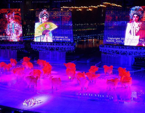 Остров Хайсиньша на реке Чжуцзян осветился 12 ноября вечером иллюминацией, превратился в фантастическую сцену, здесь прошла церемония открытия Азиатских игр. Это первая церемония открытия в истории Олимпийских и Азиатских игр вне стадиона.