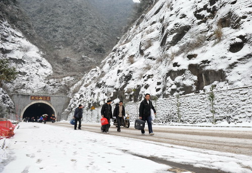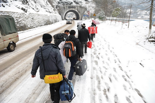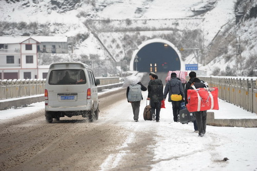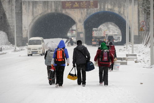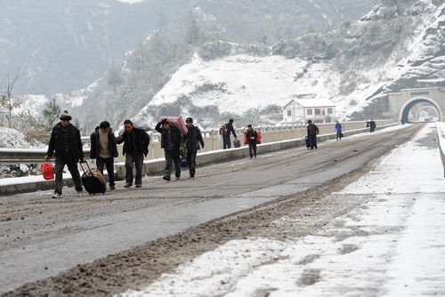 Из-за сильного снегопада в южном районе города Чунцин, многие пассажирские автобусы остановили свою работу. Люди начали испытывать тяготы длительного пути – пешком с багажом по снегу и в мороз. (Журнал «Китай»)