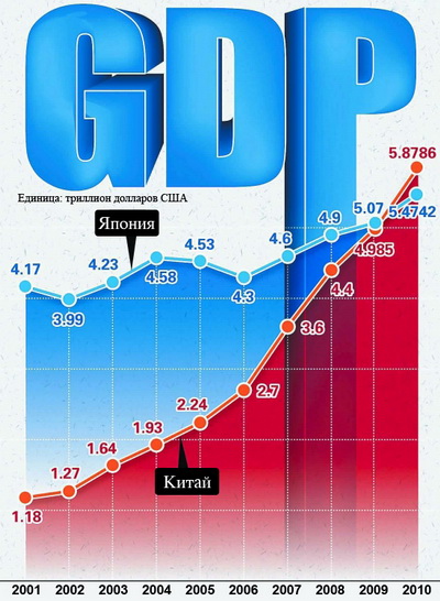По данным, опубликованным кабинетом министров Японии 14 февраля, номинальный ВВП страны в 2010 году составил 5,4742 трлн долларов США, что на 400 млрд долларов меньше уровня, которого достигла экономика Китая за тот же период. Таким образом, Япония впервые с 1968 года утратила статус «второй в мире экономической державы» .