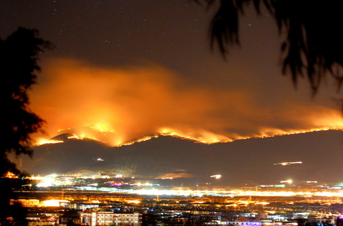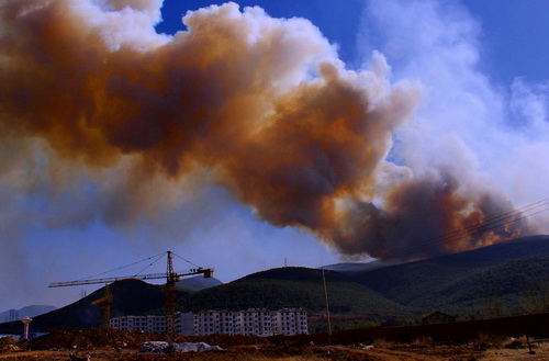 Поскольку район возгорания расположен неподалеку от аэропорта и городских районов Лицзяна, авиапассажирам и местным жителям отчетливо видно зарево пожара. (а-во Синьхуа)