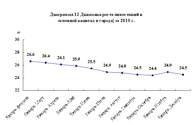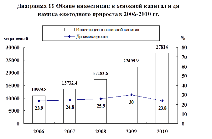 Годовые инвестиции в основной капитал во всем обществе в 2010 г. достигли 27,814 трлн юаней, что на 23,8% больше, чем в предыдущем году, за вычетом фактора цен (ревальвация валют или инфляция) фактический прирост составил 19,5%. В том числе, инвестиции в городах достигли 24,1415 трлн юаней, увеличившись на 24,5%; капитоловложения в сельских местностях составили 3,6725 трлн юаней, увеличившись на 19,7%. Инвестиции в восточных районах Китая⑹ достигли 11,597 трлн юаней, что на 21,4% больше, чем в предыдущем году; капиталовложения в центральных районах Китая – 6,2894 трлн юаней (прирост на 26,2%); инвестиции в западных районах Китая – 6,1875 трлн юаней (прирост на 24,5%); инвестиции в северо-восточных районах Китая достигли 3,0726 трлн юаней (прирост на 29,5%).