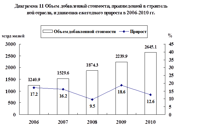 В 2010 г. объем добавленной стоимости, произведенной всем обществом в строительной промышленности, составил 2645,1 млрд юаней, увеличившись на 12,6%. Квалифицированные генеральные подрядчики и специализированные компании-подрядчики получили прибыли в размере 342,2 млрд юаней (прирост на 25,9%), в том числе, доля госпредприятий и госхолдингов составила 99 млрд юаней (прирост на 35,0%).