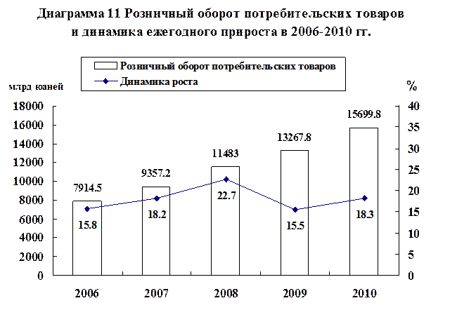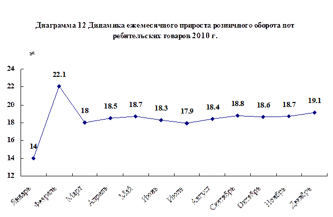 Что касается розничного оборота, реализованного «сверхлимитными предприятиями», то оборот автомобилей вырос на 34,8% по сравнению с предыдущим годом, продовольствия – на 27,9%, мяса и яиц – на 21,7%, одежды – на 25,8%, товаров ежедневного пользования – на 25,1%, культтоваров – на 23,5%, оборудования связи – на 21,8%, косметических изделий – на 16,6%, золота, серебра и драгоценностей – на 46,0%, лекарств китайской и европейской медицины – на 23,5%, бытовых электроприборов и аудиовидеотехники – на 27,7%, мебели – на 37,2%, строительных и декоративных материалов – на 32,3%. |