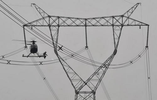 Снимок от 12 апреля 2010 г. Работы с вертолета: рабочий, обслуживающий высоковольтную линию электропередач, на платформе, спущенной вертолетом в небе над поселком Болинь района Цайдянь города Ухань (провинция Хубэй), находится на высоте 60 м над землей. Впервые в Китае при работах на высоковольтной линии с напряжением 500 тыс вольт был задействован китайский вертолет отечественного производства. До этого дня вертолетные операции такого рода были освоены только в США, Канаде и Австралии.