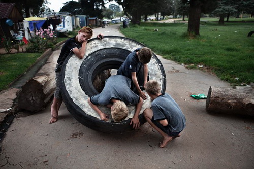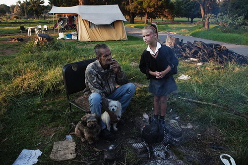 Снимок от 9 марта 2010 г. Женщина–насельница «Коронейшн-парк» (город Крюгерсдорп), который стал караван-сараем для переместившегося обнищавшего «белого» населения ЮАР. Экономический кризис жестоко ударил по «африканерам» (африканское население) Южно-Африканской Республики. При этом, кризис не пощадил и «белых»: согласно статистике, примерно 1/10 часть «белого» населения ЮАР живет за чертой бедности; среди них 100 тыс. человек просто борются за выживание.