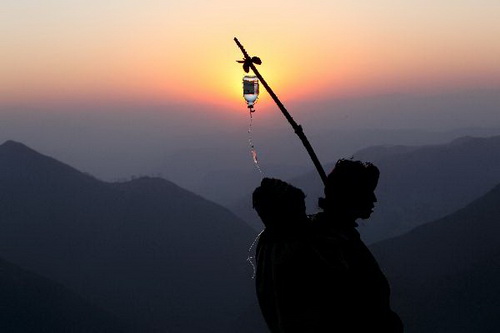 4 января 2010 г. женщина из уезда Мейгу юго-западной провинции Сычуань возвращается домой, держа на руках своего сына, которому поставили капельницу. В связи с продвижением сельской кооперативной системы медицинского обслуживания нового типа все большее количество крестьян получает доступ к медицинскому обслуживанию.
