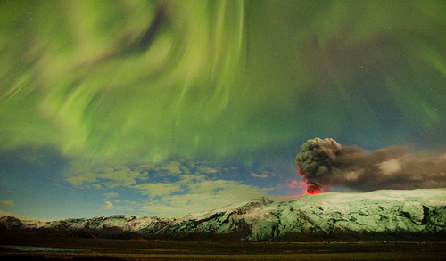 22 апреля 2010 г. Северное сияние в небе при извержении вулкана Эйяфьядлайекюдль в Исландии