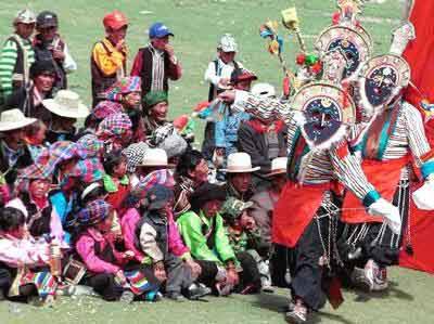 В Тибете много народных самодеятельных трупп Тибетской оперы. В любое время и повсюду, не только на площадях в сельской местности можно видеть эти труппы. Люди со всех окрестностей приходят смотреть представление, и зрителей собирается так много, что часто яблоку негде упасть.