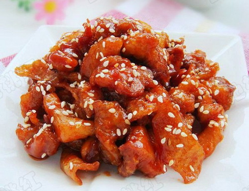 Куриная грудка – 200 г, куриное яйцо (белок) – 20 г, растительное масло – 100 г, немного соли по вкусу, сахар – 5 г, белый уксус – 5 г, кетчуп – 30 г, крахмал – 20 г, шаосинское рисовое вино – 2 г, черный кунжут – 2 г.