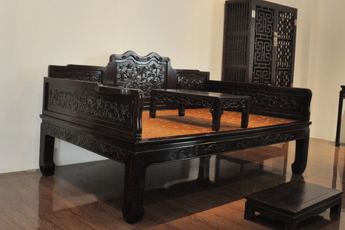Такие диванчики с задней спинкой и двумя боковыми появились в Китае как принадлежность буддийских монахов. Их называли «лоханьчуан», что в дословном переводе означает «кровать (ложе) для архатов». Архат – это «достойный» в буддийской вере, тот, кто достиг высокой степени совершенства и вышел из цепи перерождений. На таком «диванчике для архатов» сидели и беседовали два ученых мужа или монаха. Примерно до 1911 г., т.е. до Китайской Республики, самому почетному гостю хозяева предлагали присесть на кровать или кан, а с появлением «диванчиков для архатов» интерьеры знати или служилого сословия уже украшали специальные сиденья для неспешных и бесед «о высоком». В древнем Китае существовали понятия «большего сна» и «малого сна»; под первым понимали полноценный ночной сон, а под вторым – короткий сон после обеда. Так вот, на упомянутых диванчиках можно было подремать в отсутствие собеседника, почитать книгу или, допустим, буддийский канон. В музее демонстрируется «алоханьчуан», сделанная из розового дерева, которое растет в Юго-Восточной Азии. Это дерево – очень плотное и тонет в воде, поэтому его сплавляют, привязав к бамбуковым плотам. Древесина розового дерева относится к ценным породам и бывает разного цвета – от розоватого до красного. Она ценится так же, как и красный сандал.