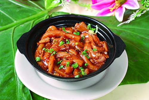 Ингредиенты,приправы, специи: Длинные фиолетовые баклажаны – 2 шт., свиной фарш – 50 г, морковь – 100 г, бамбуковые побеги – 100 г, древесные грибы «муэр» – 2 шт.; зеленый лук – 15 г, имбирь – 10 г, чеснок – 10 г, бобовая паста – 1 ст. л., кунжутное масло – половина чайной ложки, соевый соус и салатный соус – по половине чайной ложки, соль – 2 г, сахар – 5 г, шаосинское рисовое вино – 5 г, немного порошка черного перца, крахмал – 2 ложки, вода – 12 г. Процесс приготовления: 1) Очистить баклажаны и нарезать тонкими полосками длиной 7 см; 2) В свиной фарш добавить приправы и специи, размешать и оставить на 20 мин. Вымоченные в теплой воде грибы нарезать соломкой вместе с морковью и побегами бамбука; 3) Поставить сковороду на огонь и налить в нее растительное масло. Когда масло разогреется, обжарить баклажан на среднем огне, не давая пригореть; 4) Обжарив баклажаны до золотистого цвета (ломтики должны стать мягкими настолько, что их можно легко проткнуть палочками), выложить их на блюдо с помощью шумовки. Чтобы избавиться от излишков масла, можно опустить баклажаны на несколько секунд в кипяток. 5) Снова поставить сковороду с маслом на огонь и положить туда натертый чеснок; когда чеснок даст аромат, добавить к нему, помешивая, мелко нарезанный лук и имбирь, а также бобовую пасту; 6) Выложить в сковороду фарш, добавить побеги бамбука, мелко нарезанную морковь и грибы; 7) Когда бамбук, морковь и грибы будут готовы, положить баклажаны, полить сверху соевым соусом и салатным соусом, приправив по вкусу солью и сахаром; 8) Тушить на большом огне до полной готовности баклажанов, добавить куриную эссенцию (аналог куриного бульона в кубиках), разведенный в воде крахмал и кунжутное масло. 9) Переложить получившееся блюдо в разогретый горшок и, посыпав сверху луком, томить на медленном огне в течение 5 минут. Приятного аппетита! |