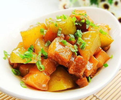 Свинина (из брюшной части без костей и кожи) – 500 г, белая редька – 250 г, немного растительного масла, соль – 5–10 г, соевый соус – 10 мл, леденцовый сахар – 5 г, зеленый лук – 5 г, имбирь – 5 г, шаосинское рисовое вино – 5 мл.