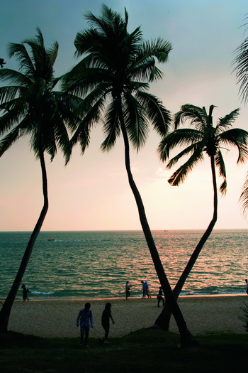 Ура, мы в тропиках! Первым делом – к морю, на городской пляж Санья. Пальмы, море и песок – прямо из рекламы «Баунти»! Похоже, это самый «китайский» пляж всего курорта, тут проводят время местные жители. Китайцы в пижамах ловят рыбу, запускают воздушных змеев. Играют уличные ансамбли, и один китаец даже импровизирует на саксофоне. Купаются дети, местные торговцы продают кокосы, сахарный тростник, какие-то дуделки и портреты Мао Цзэдуна. С подплывающих суденышек выносят на продажу рыбу и всяких морских гадов. Женщины с коричневыми зубами предлагают гроздья жемчуга. И никто не загорает, китайцы предпочитают отдыхать в тени зонтов и пальм. Сразу за пальмами начинается город. Санья – лохматый, невзрачный, но живой город. На улицах постоянно кипит жизнь. Днем и ночью улицы метут уборщицы в плетеных шляпах и рыжей униформе. Интересно, что большая часть черновой работы в городе – на женщинах. Это рикши, уборщицы, торговки жемчугом, садоводы. Настежь открыты проемы всевозможных лавчонок, гремит музыка, старики, как обычно, играют в мацзян, столы забегаловок посреди улицы заняты жующими, курящими, болтающими посетителями, шипят шашлычки. Все так по-китайски, и даже не пахнет курортом. Разве что лотки с туристическими принадлежностями повсюду: в них одинаковые цветастые пляжные костюмы, купальники, надувные круги… Вот только в поисках защитного крема от солнца пришлось обегать полгорода. Зато в Санья сотни рыбных ресторанчиков с морепродуктами во всем их разнообразии. Снаружи они похожи на зоомагазины с аквариумами вместо витрин. Чем свежее, тем вкуснее, считают китайцы и вылавливают будущее блюдо из аквариума у тебя на глазах. Мы присаживаемся за уличный столик и вливаемся во всеобщий галдеж. Китайские повара превосходно готовят любую рыбу.