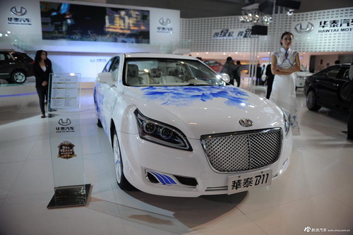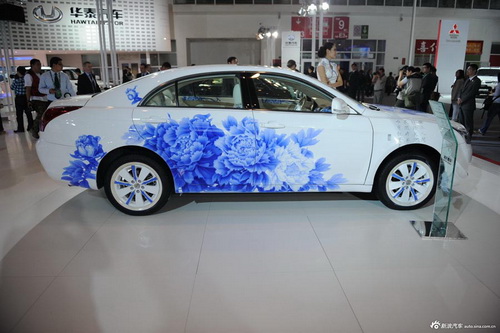 На выставочной зоне китайской автокомпании «Хуатай» представлен автомобиль Hawtai B11 с сине-белыми фарфоровыми узорами.( «Жэньминь жибао» он-лайн)