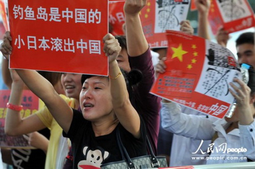 Акция протеста началась с утра, ее участники держали в руках транспаранты с такими надписями, как "Острова Дяоюйдао принадлежат Китаю", и громко пели государственный гимн КНР.