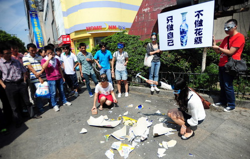 16 сентября перед воротами одного университета в городе Учан (часть города Ухань провинции Хубэй), группа девушек в масках, выкрикивая лозунг «Не быть вазой, а быть собой!» (на китайском сленге "ваза" также означает "красивая, но пустая девушка"), разбили вазу высотой около 1,2 метров. Организаторы акции отметили, что для студенток гораздо важнее обретение мудрости и личной независимости.(<<Жэньминь жибао>> он-лайн)