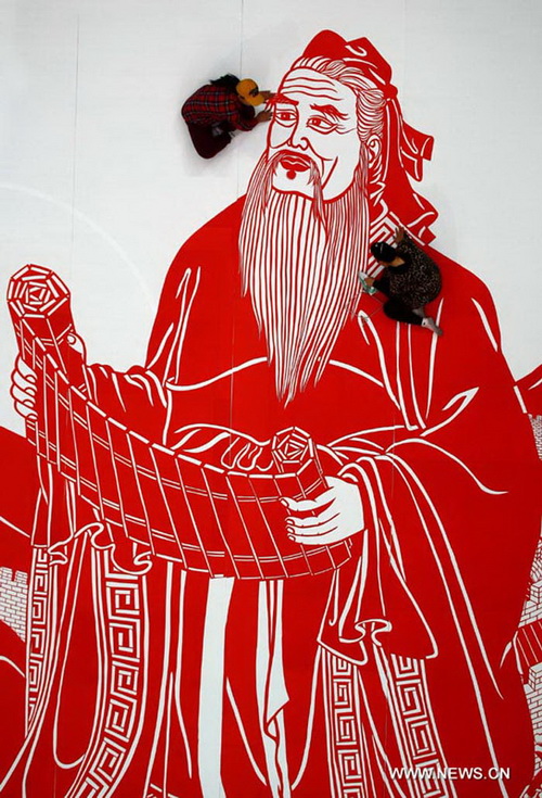 Огромная вырезанная из бумаги картина "Два великих мудреца Китая" длиной 26,30 метра и шириной 17,36 метра, на создание которой мастер Гао Сяодун потратил более 15 месяцев, была сегодня выставлена в городе Хэцзинь провинции Шаньси /Северный Китай/.( <<Жэньминь жибао>> он-лайн)