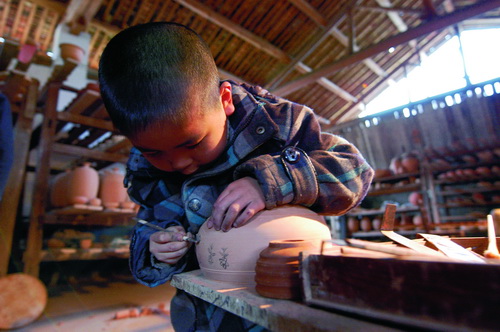 ![]() Наследник в 7-м поколении древней мастерской по изготовлению фарфора «Цзэнциньцзи» надеется, что его сын унаследует его мастерство, поэтому он поощряет знакомство мальчика с процессом фарфорового производства (фото CFP)