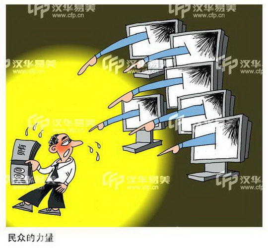По мере непрерывной популяризации Интернета широкие массы населения Китая стали собирать доказательства и изобличать факты получения и дачи чиновниками взяток, публикуя соответствующую информацию в своих блогах и выкладывая в сети видеозаписи. В 2012 г., именно благодаря активной жизненной позиции интернет-пользователей, были сняты с занимаемых должностей и привлечены к ответственности глава Управления по надзору за безопасностью на производстве провинции Шэньси Ян Дацай, который владеет несколькими роскошными часами, и политический комиссар фаньюйского филиала Бюро по делам городского управления Гуанчжоу Цай Бинь, который приобрел аж 21 квартиру.