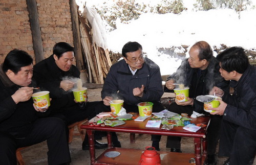![]() На снимке: после ознакомления с ситуацией в районе бедствия и встречи с местными жителями Ли Кэцян и сопровождающие его лица едят лапшу быстрого приготовления и одновременно обсуждают работу по ликвидации последствий стихии.