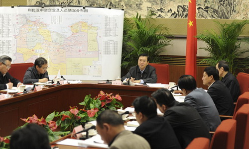 На снимке: 26 февраля 2011 года Чжан Дэцзян в Пекине созвал второе пленарное заседание штаба по эвакуации находившихся в Ливии китайских граждан и обеспечению их безопасности.