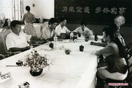 ![]() 1983 г., уезд Чжэндин провинции Хэбэй: Си Цзиньпин в своем рабочем кабинете (фото Синьхуа) Широкие народные массы занимают самое важное место в сердце Си Цзиньпина. Низовые организации – это место, где он чаще всего бывает.