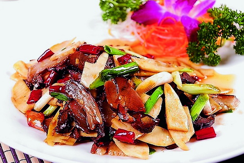 Побеги бамбука (кит.: «дунсунь») – 300 г, бекон – 150 г, зеленый лук – 5 г, имбирь – 5 г, чеснок – 5 г, немного соли и сухого перчика чили. Процесс приготовления: