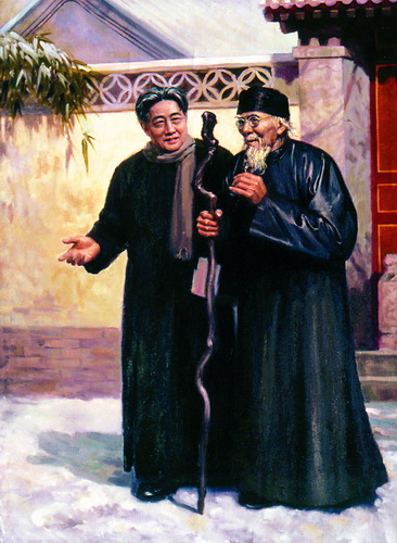 ![]() Несмотря на большую разницу в возрасте, Ци Байши и Сюй Бэйхун (слева) относились друг к другу с большим уважением. Художник изобразил их как близких соратников и друзей (фотобаза «Жэньминь хуабао»)