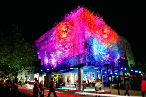 Музей славится необычным внешним видом. В стеклянные наружные стены высотой 8,5 м «инкрустированы» два крупных куста древовидных пиона, которые стали символом музея. Кусты пионов изготовлены из нержавеющей стали, а каждый цветок (шириной 54 м и весом в полторы тонны) сделан вручную из 5025 стеклянных кирпичей. На сборку этих цветов ушло три месяца. Стоит отметить, что все «лепестки» цветов – разные, они отличаются друг от друга и были спрессованы при высокой температуре. В результате внешние стены музея днем выглядят как горные породы с шероховатой поверхностью, а вечером становятся яркими и блестящими.