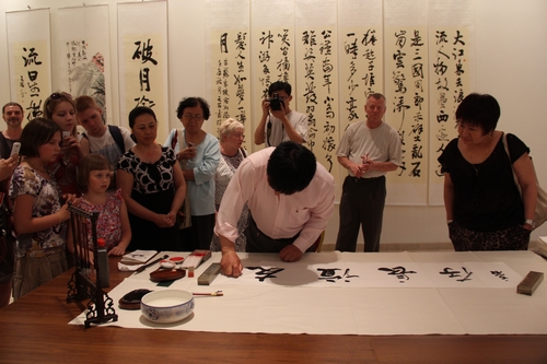 После официальной части большое внимание аудитории привлекла выставка традиционной китайской каллиграфии и живописи, на открытие которой специально приехал сам автор, каллиграф-живописец Тянь Ши. Он продемонстрировал свое искусство, нанося на бумагу иероглифы прямо на глазах у восторженной публики: из-под его кисти выходили надписи «Вечная дружба», «Мир вашему дому», «Терпение и труд все перетрут» и другие, эти работы мастер Тянь Ши подарил российским друзьям.