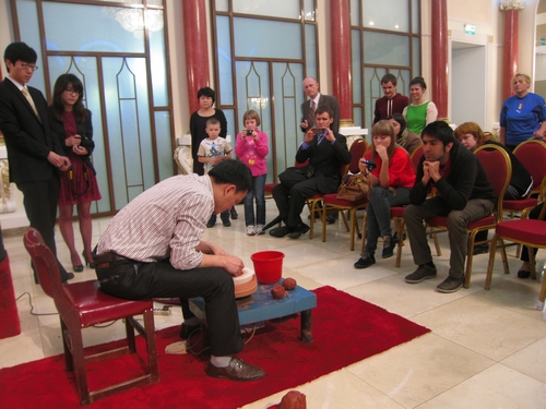 Вторую лекцию прочитал мастер народного искусства У Цзиньцюань. Он рассказал о традиционных гуандунских техниках создания чайников, об особенностях технологии ручного изготовления глиняных чайников, о составе, функциях и ценности этих чайников. Чтобы не быть голословным, он на практике продемонстрировал слушателям процесс изготовления чайников. (Журнал «Китай» в Москве)