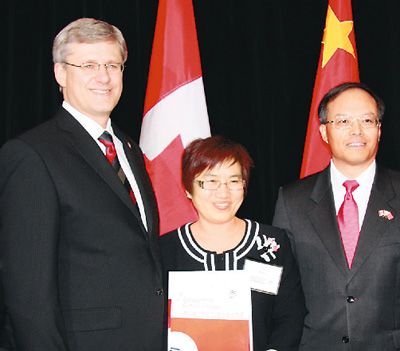 ![]() На снимке: Премьер-министр Канады Харпер принял участие в «Китайско-канадском культурном диалоге и Праздновании по поводу 40-летия установления дипломатических отношений между Китаем и Канадой», проведенном в Оттаве. (В середине – У Юнгуан, справа посол Китая в Канаде Лань Лицзюнь)