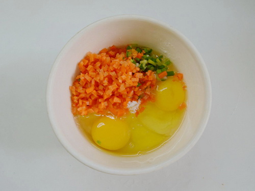 ![]() 2. Положить мелко нарезанные морковь и лук-батун в большую миску, туда же положить муку и вбить яйца, тщательно помешать.