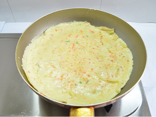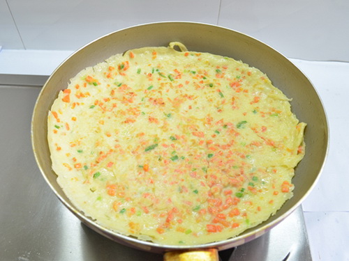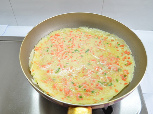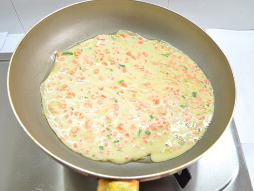 ![]() 5. Когда масло нагреется, вылить туда жидкое тесто, и мягко вращать сковороду, чтобы оно равномерно покрыло дно сковороды.