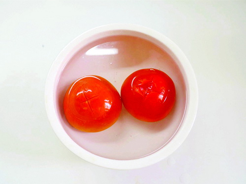 2. Сделать крестообразный надрез в верхней части помидоров. Положить помидоры в миску и, наполнив миску кипятком, оставить на одну минуту.