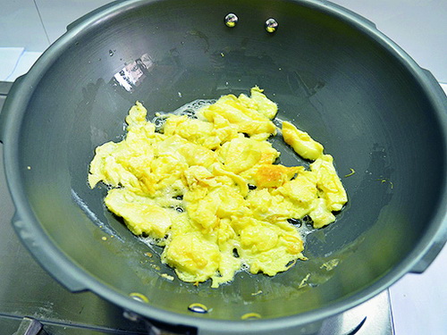 5. Налить в сковороду растительное масло и разогреть. Потом влить туда взбитые яйца и поджарить, чтобы они затвердели. Разрезать их лопаткой на куски и откинуть на тарелку.