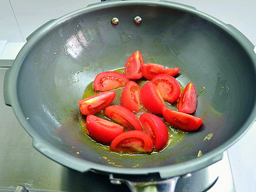 6. Положить кусочки помидора в сковороду и обжаривать, помешивая в течение минуты.