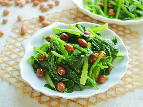 О блюде: Это прохладный и вкусный салат. Основными ингредиентами являются арахис и шпинат, которые лучше всего есть летом. Это блюдо пополняет запасы влаги и минеральных солей в организме человека, является необходимым блюдом для избавления от жара. Основные ингредиенты: шпинат – 200 г., очищенный арахис – 60 г. Приправы и специи: соль – 3 г., растительное масло – 300 г., куриный экстракт – 1 г., кунжутное масло – 5 г.