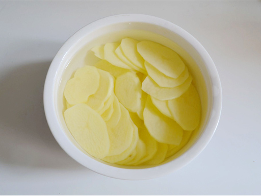 | 1. Очистить картофель и нарезать ломтиками. Промыть и положить в чистую воду. |