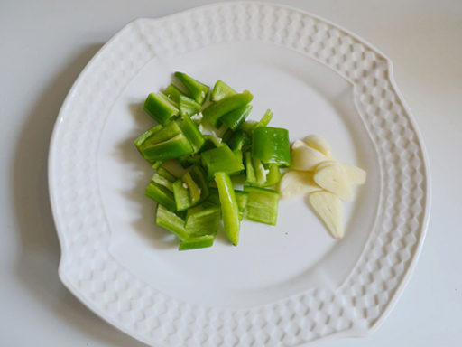 | 2. Удалить семена сладкого зеленого перца и нарезать его кусочками. Нарезать чеснок ломтиками. |