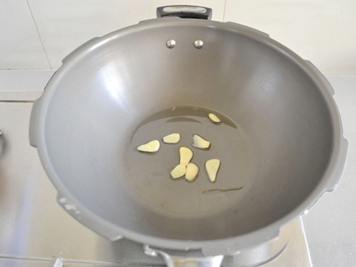 | 3. Раскалить сковороду и влить туда 10 г. растительного масла. Положить чеснок и обжарить до появления аромата. |