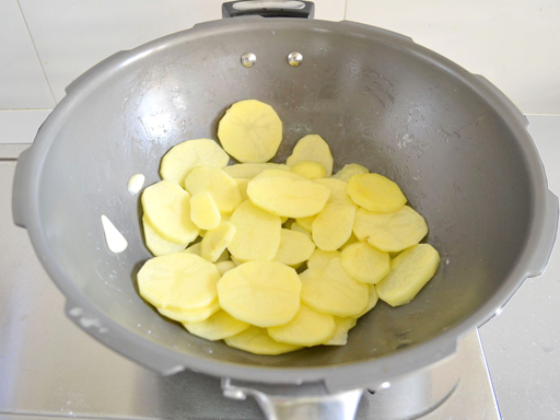 | 4. Выловить ломтики картофеля и положить в сковороду, жарить, помешивая, в течение минуты. |