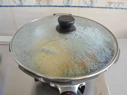 | 7. Добавить немного воды в сковороду и хорошенько помешать. Закрыть сковороду крышкой и тушить на маленьком огне примерно 3 минуты. |