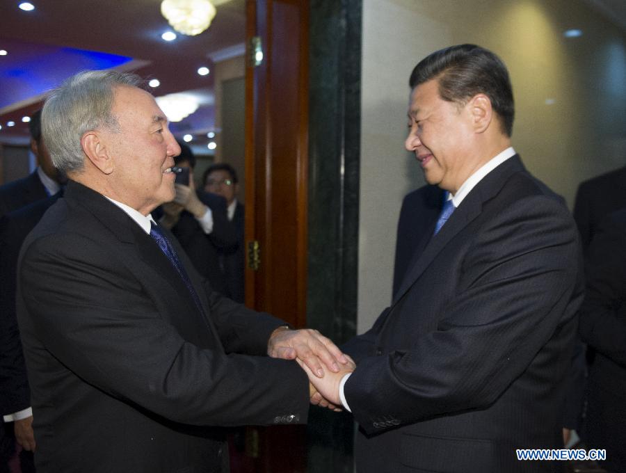Президент Казахстана сказал, что, благодаря заботе председателя КНР Си Цзиньпина, отношения между Казахстаном и Китаем подняты на высокий уровень, взаимные контакты на высшем уровне успешно развиваются, стратегическое сотрудничество дает плодотворные результаты. Я ценю дружбу с председателем КНР Си Цзиньпином и намерен поддерживать с ним тесные контакты для продвижения сотрудничества между двумя странами. Казахстан надеется на то, что, используя совместное строительство экономического пояса "Шелкового пути", стороны смогут расширить сотрудничество в области энергетики, взаимных инвестиций, обрабатывающей промышленности и трансграничной транспортировки и построить газопровод "Центральная Азия--Китай", чтобы повысить уровень сотрудничества между Казахстаном и Китаем и центральноазиатскими странами и Китаем".