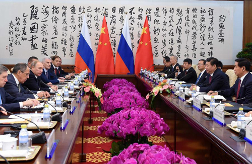 В. Путин, со своей стороны, отметил, что полностью одобряет оценку Си Цзиньпина российско-китайских отношений. Стороны усиленно продвигают развитие российско-китайских всесторонних отношений стратегического взаимодействия и партнерства, непрерывно углубляют политический диалог, успешно продвигают сотрудничество в сфере энергоносителей, в торгово-экономическом сотрудничестве достигнуто еще больше практических результатов. Стороны тесно сотрудничают в международных делах, оказали мощную поддержку безопасности и стабильности в мире и в регионе. Он выразил уверенность, что сегодняшняя встреча придаст новые движущие силы развитию российско-китайских отношений.
