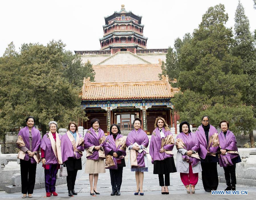 11 ноября -- Супруга председателя КНР Си Цзиньпина Пэн Лиюань сегодня пригласила жен лидеров экономик АТЭС на экскурсию по летнему дворцу "Ихэюань".